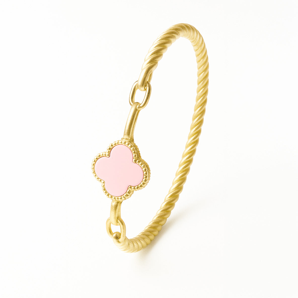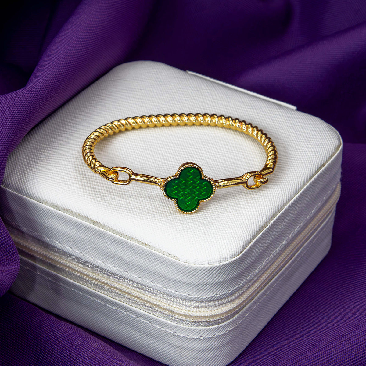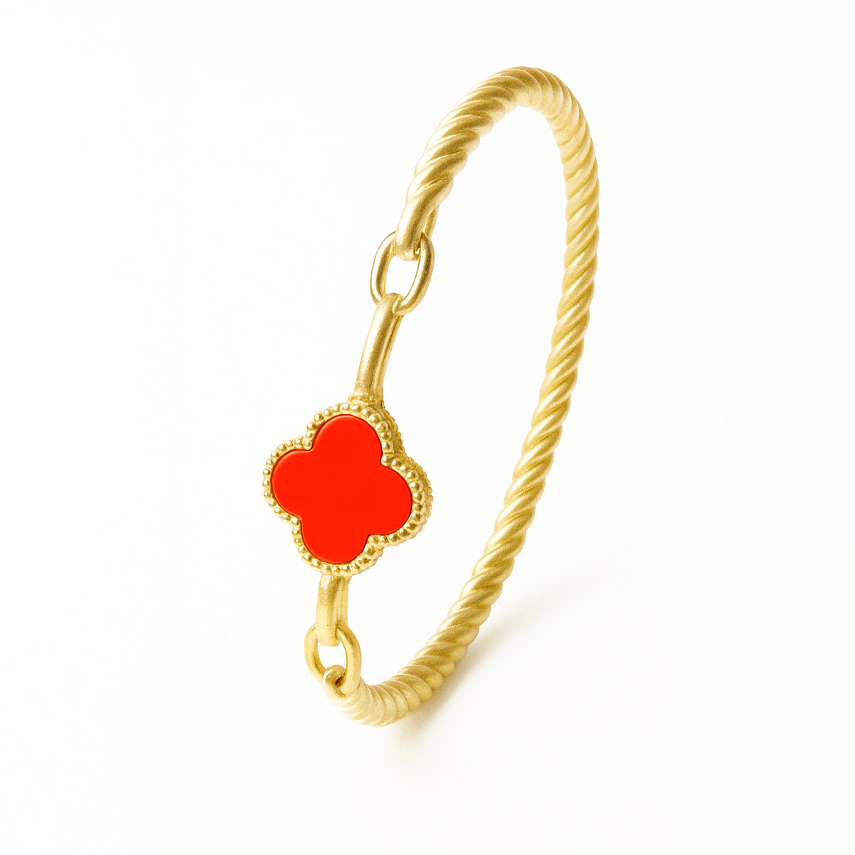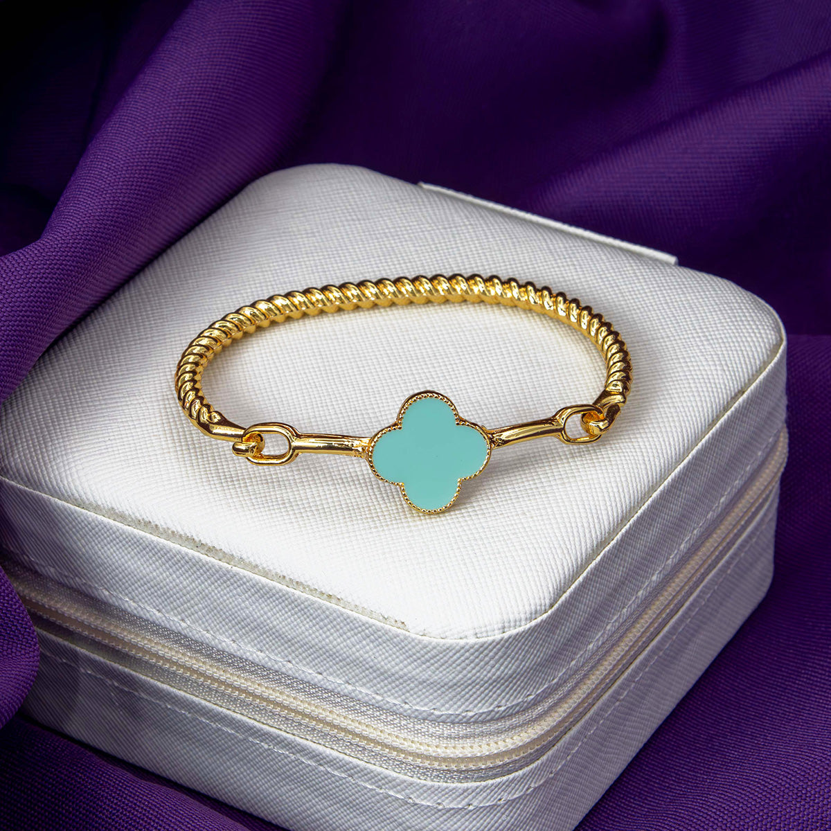 Com design de fio torcido e acabamento dourado, este bracelete é enriquecido com um charmoso trevo multicolorido — um símbolo de sorte e proteção para acompanhar você todos os dias.