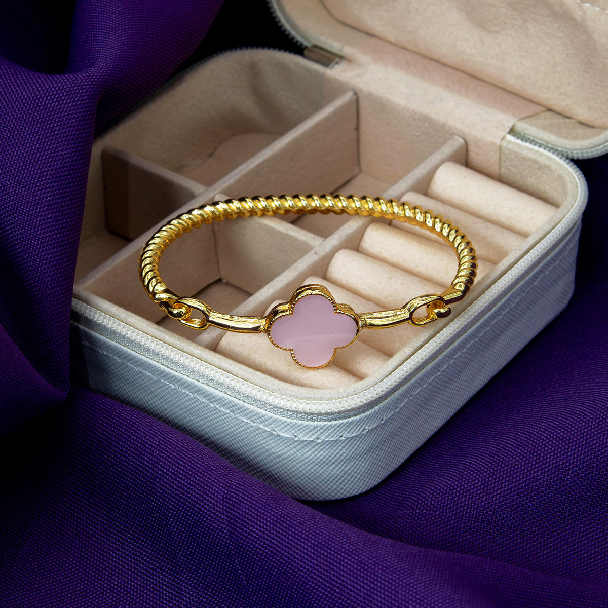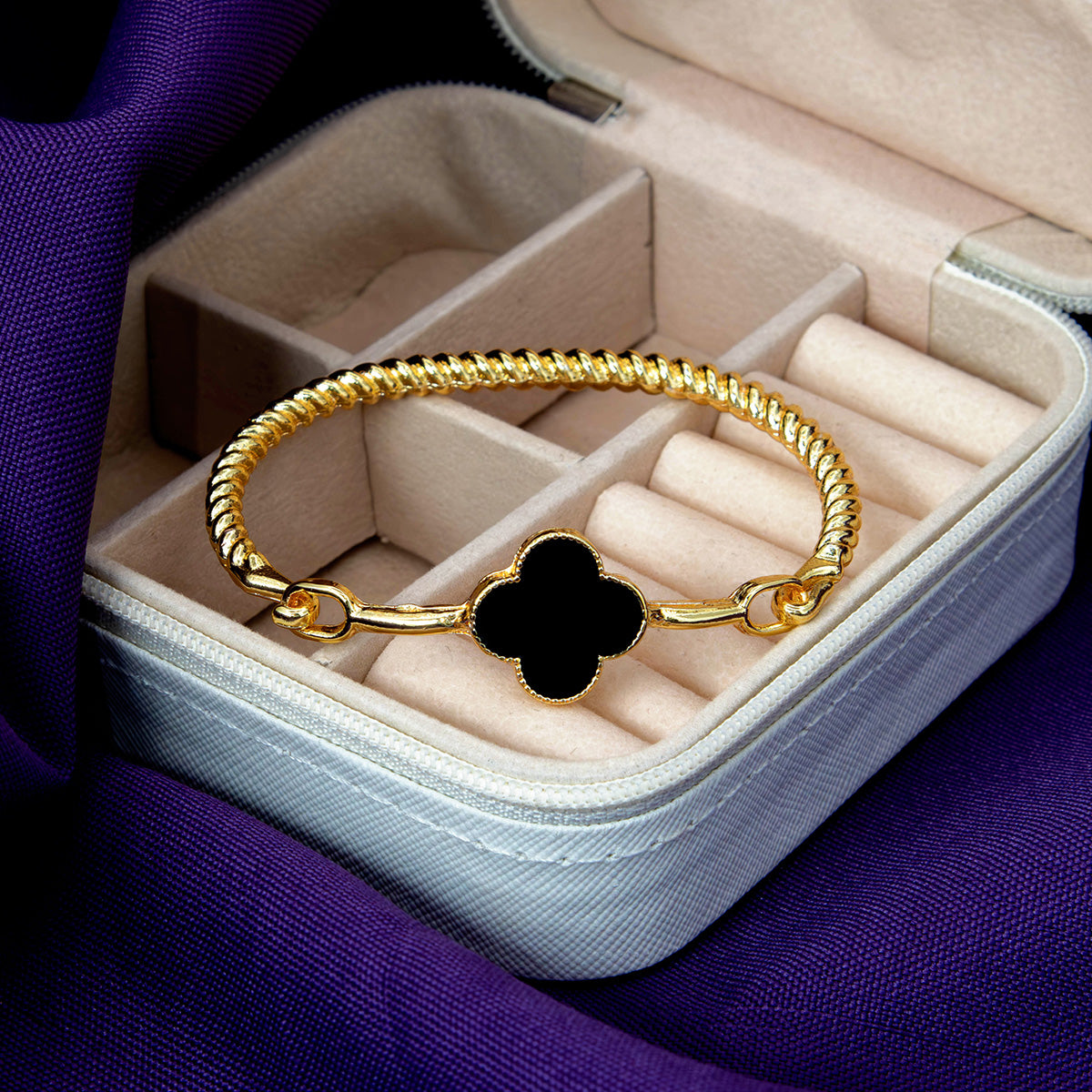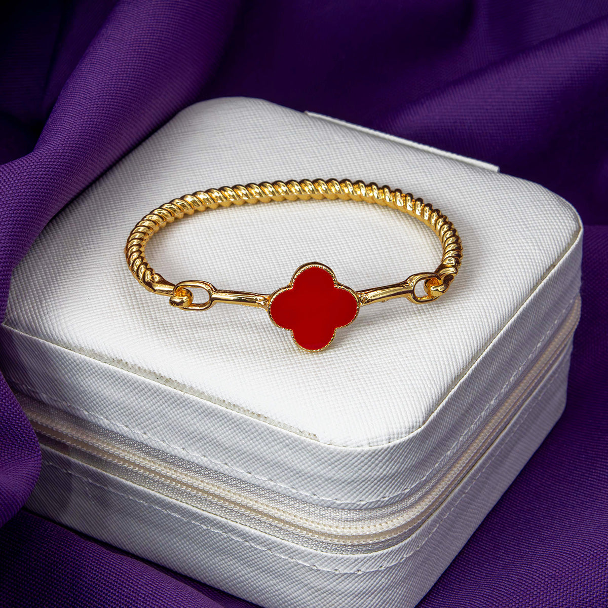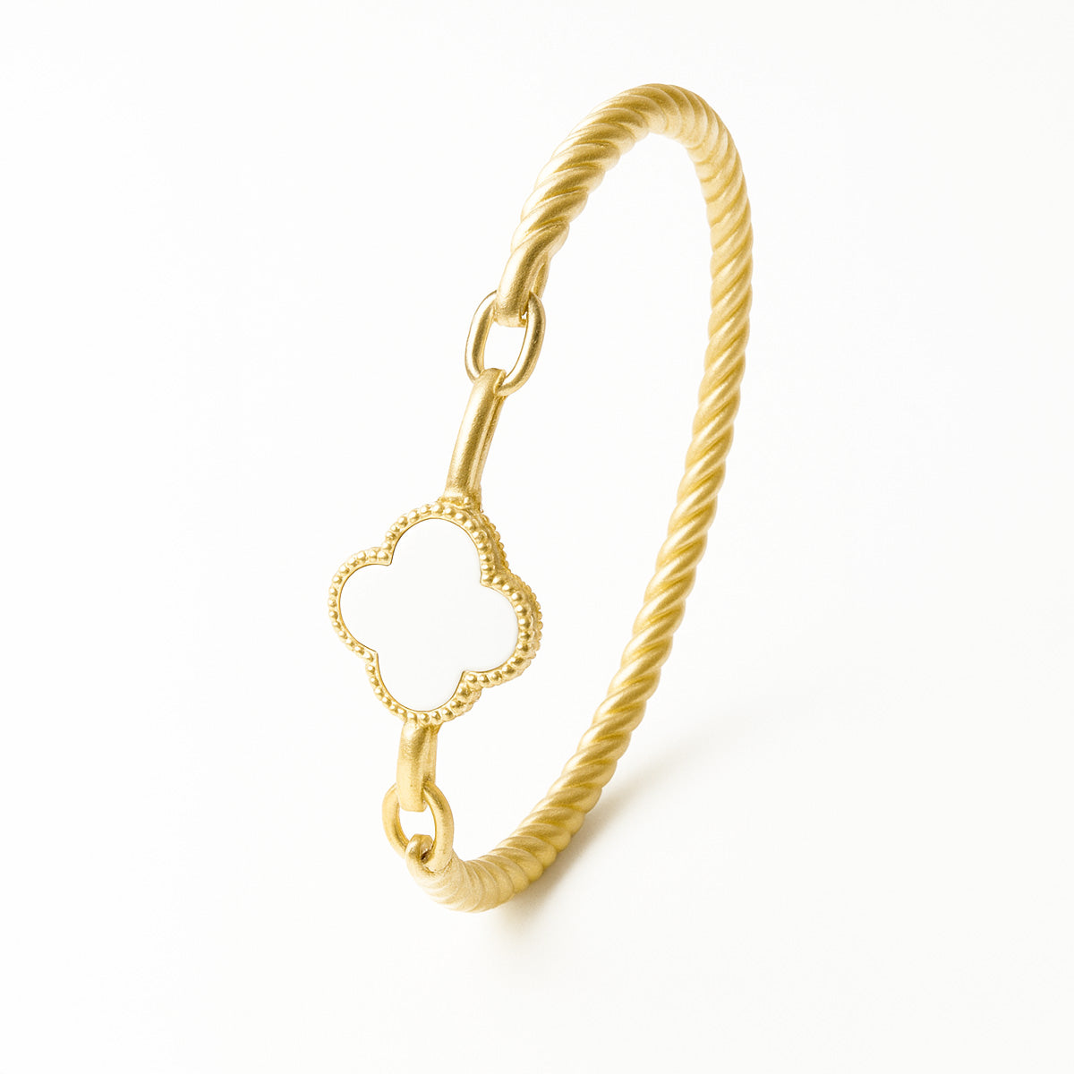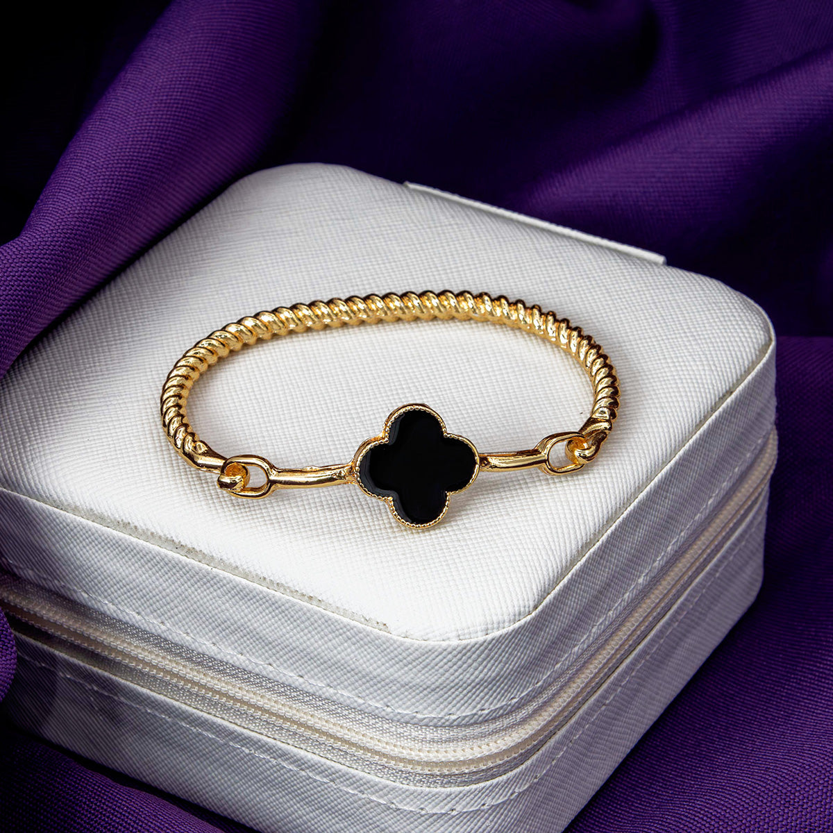 Com design de fio torcido e acabamento dourado, este bracelete é enriquecido com um charmoso trevo multicolorido — um símbolo de sorte e proteção para acompanhar você todos os dias.