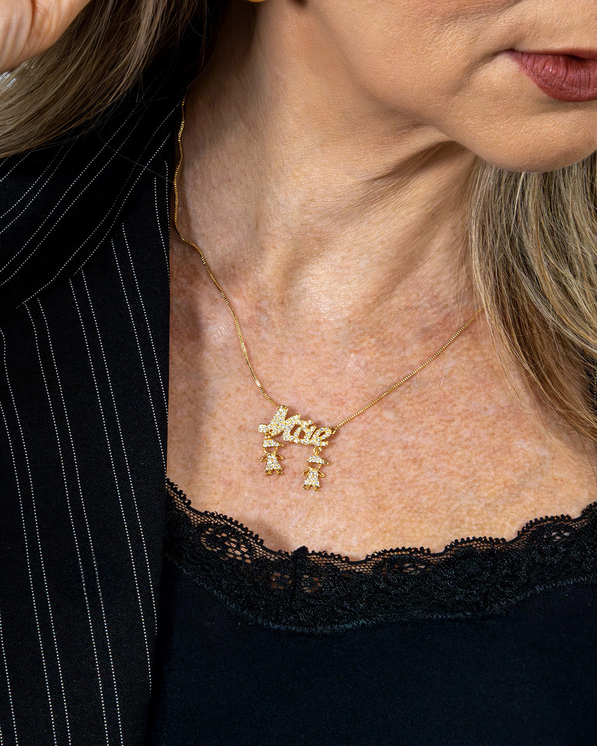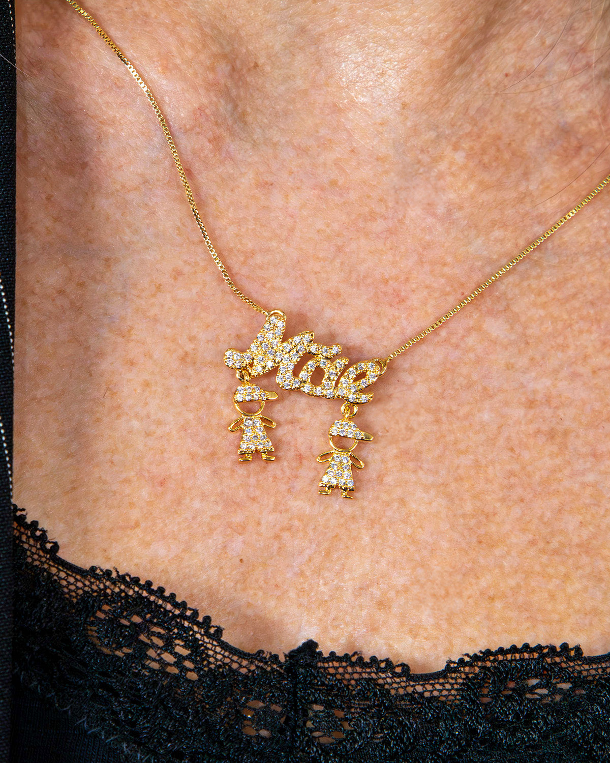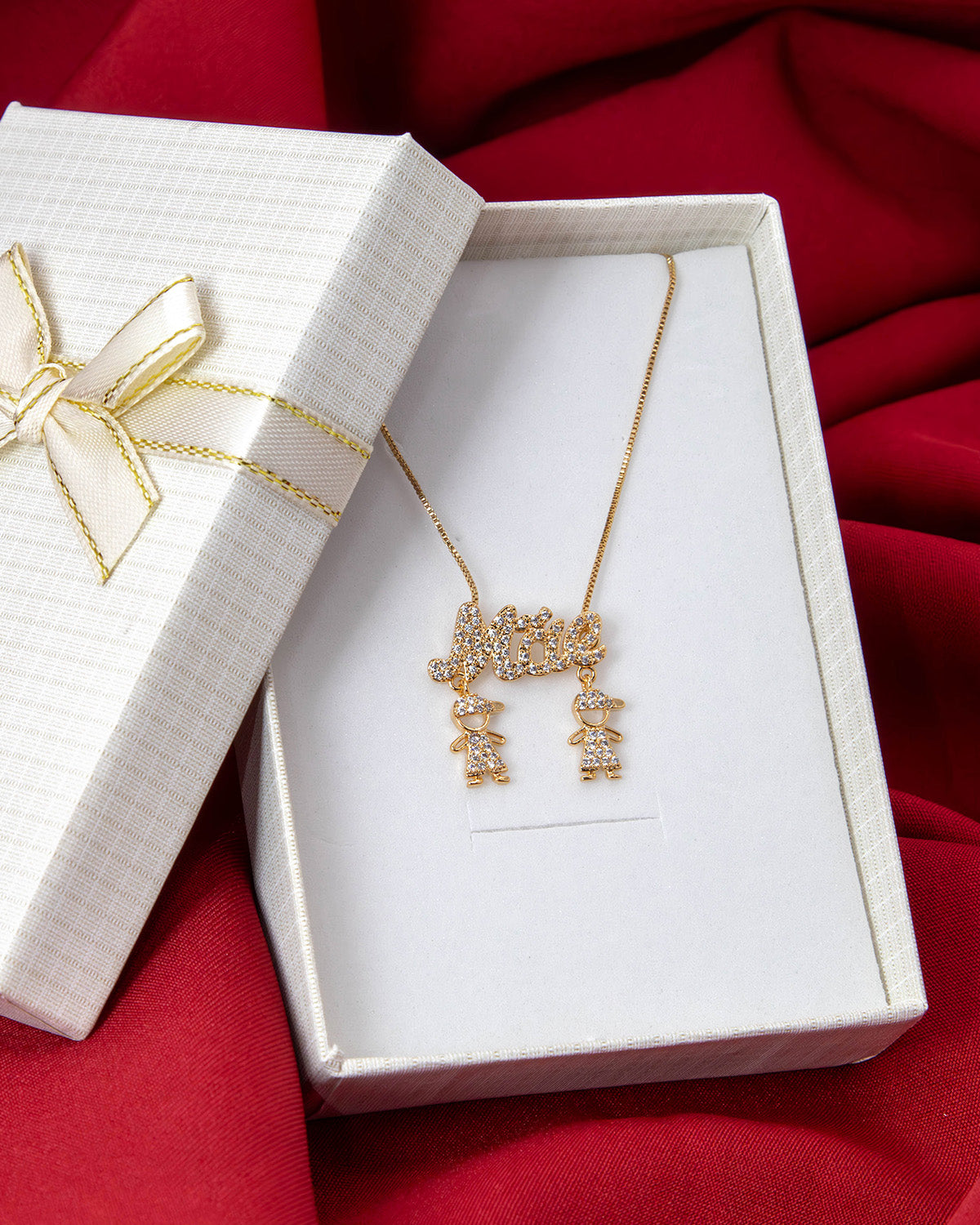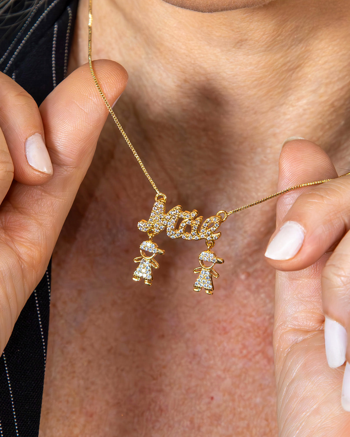 ✨ Este colar é a representação perfeita do vínculo eterno entre mãe e filhos. Com o nome "Mãe" em destaque e dois pingentes de meninos pendurados delicadamente, essa joia emociona e encanta em cada detalhe. As zircônias cravejadas proporcionam brilho sofisticado, enquanto o banho em Ouro 18K garante um acabamento luxuoso e duradouro.