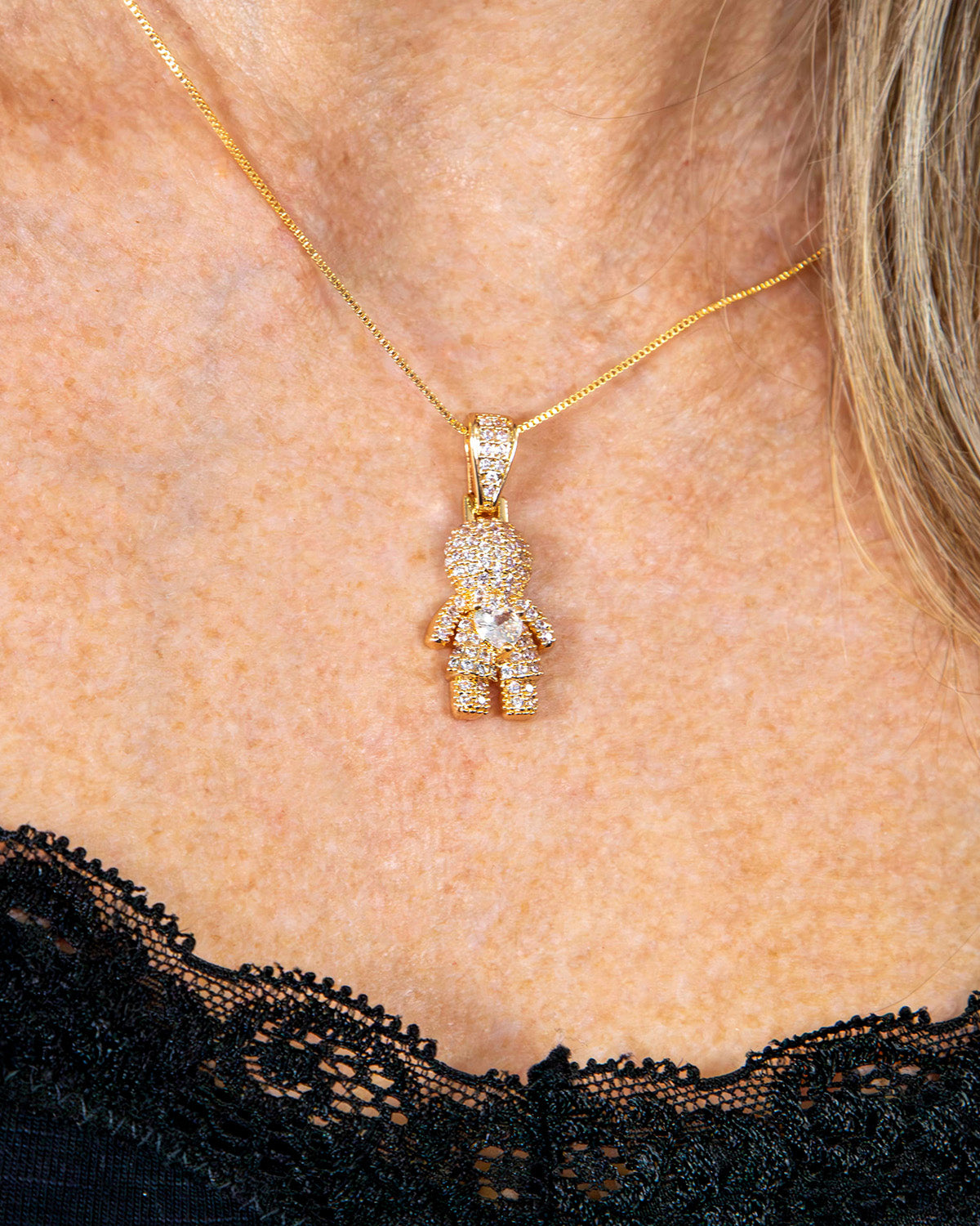 O pingente delicado apresenta um boneco de criança com um coração cravejado com micro zircônias, em um design moderno e cheio de simbolismo.