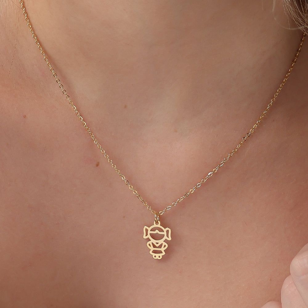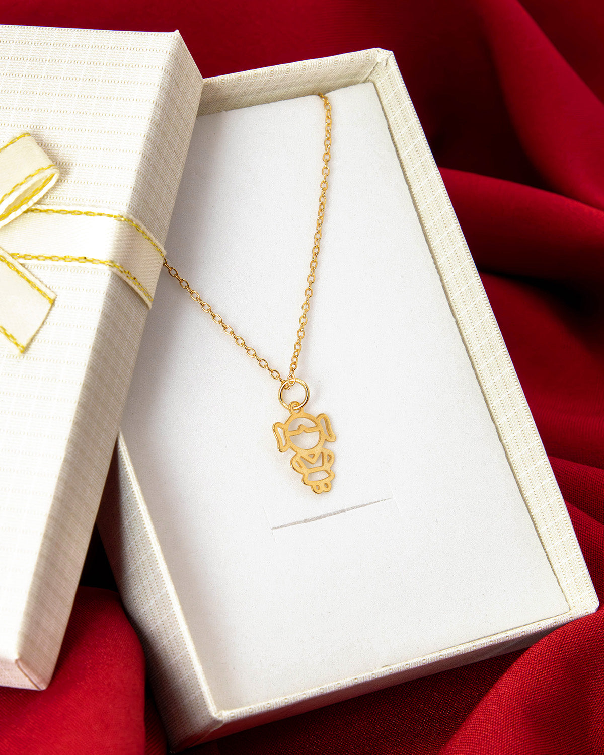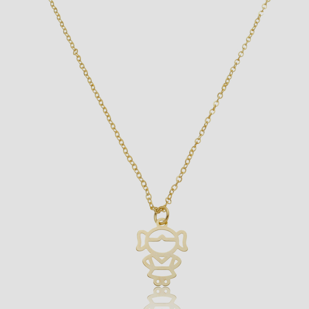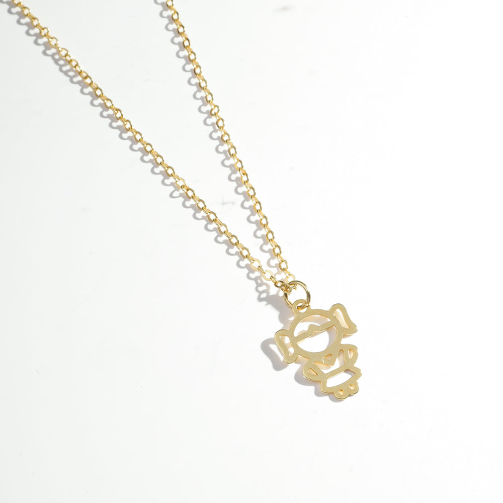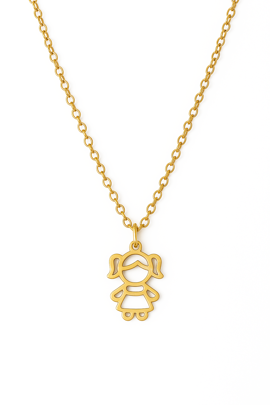 Pingente vazado em forma de criança, leve e delicado, com traços suaves que simbolizam amor, inocência e conexão.