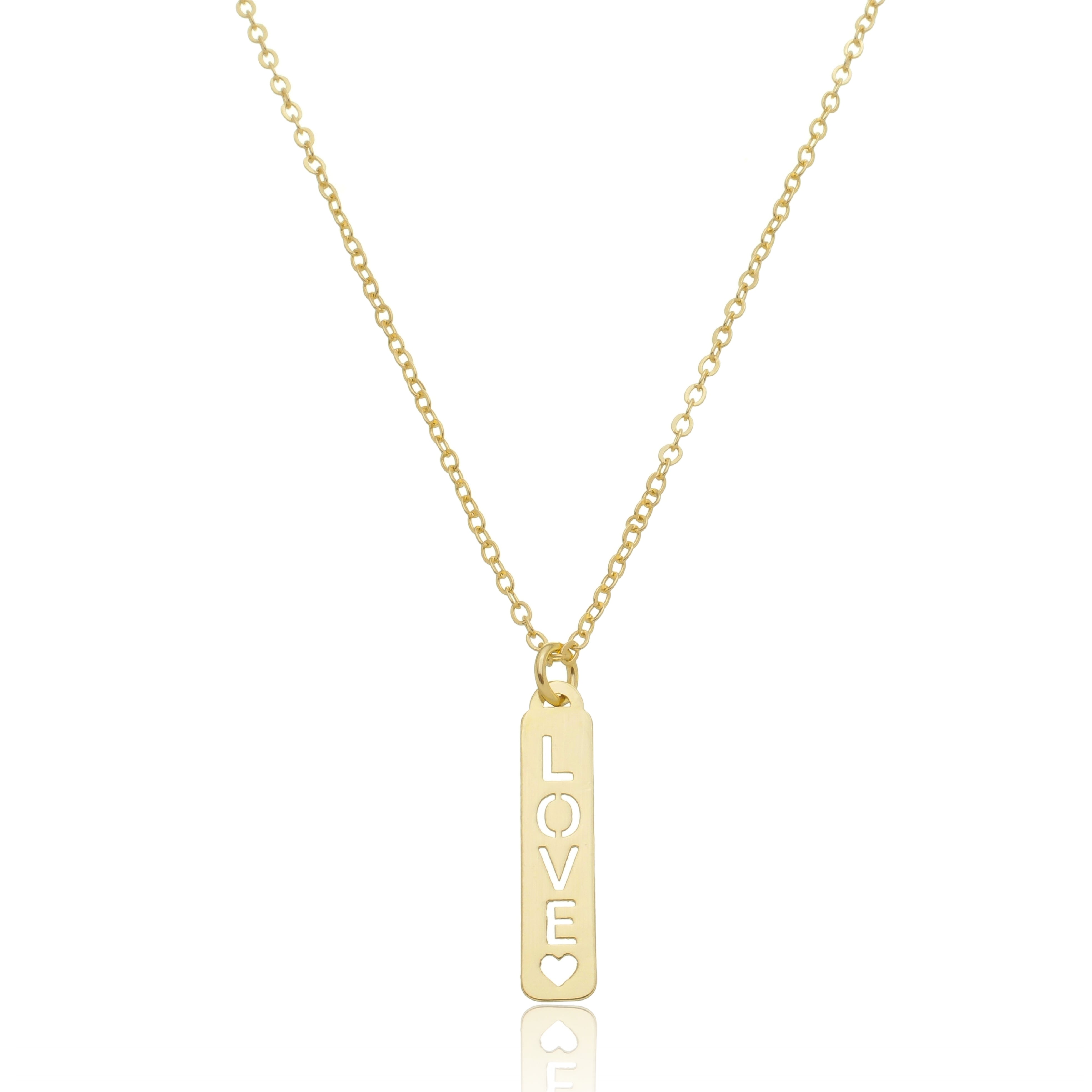 Adicione um toque de sofisticação e sentimento ao seu visual com o colar Love Plaquinha Vertical banhado a ouro 18K.