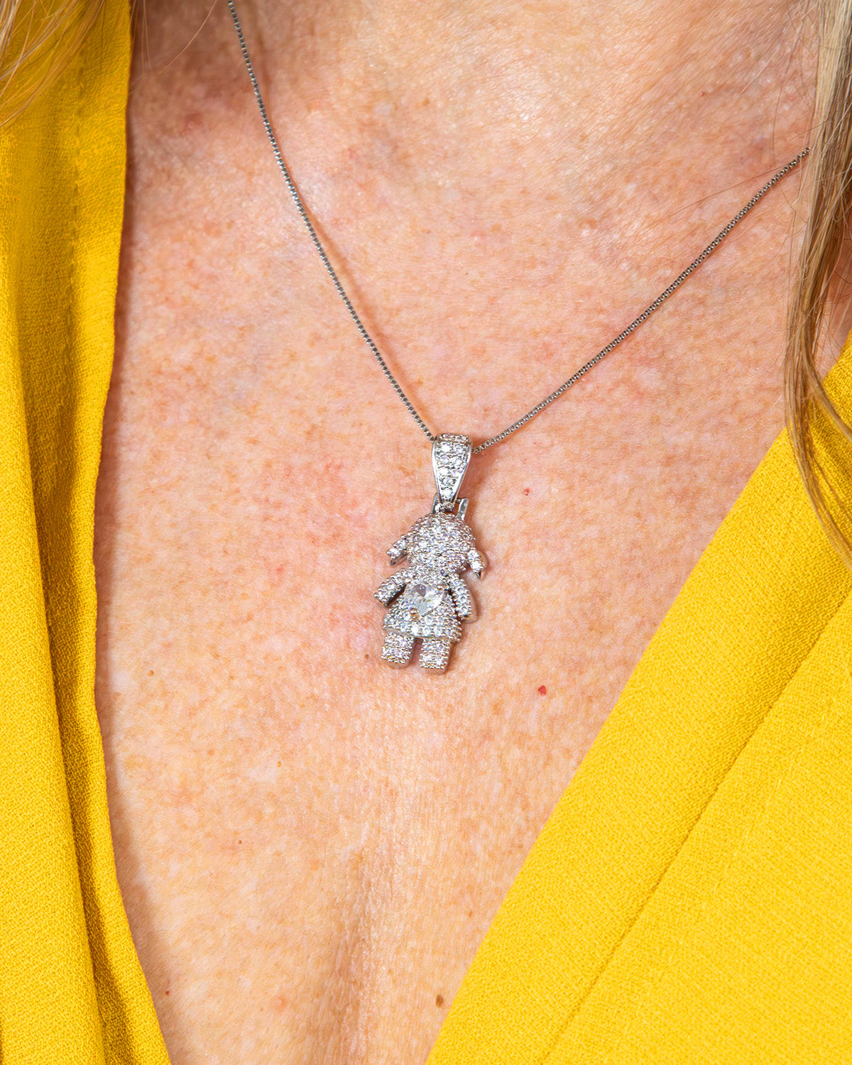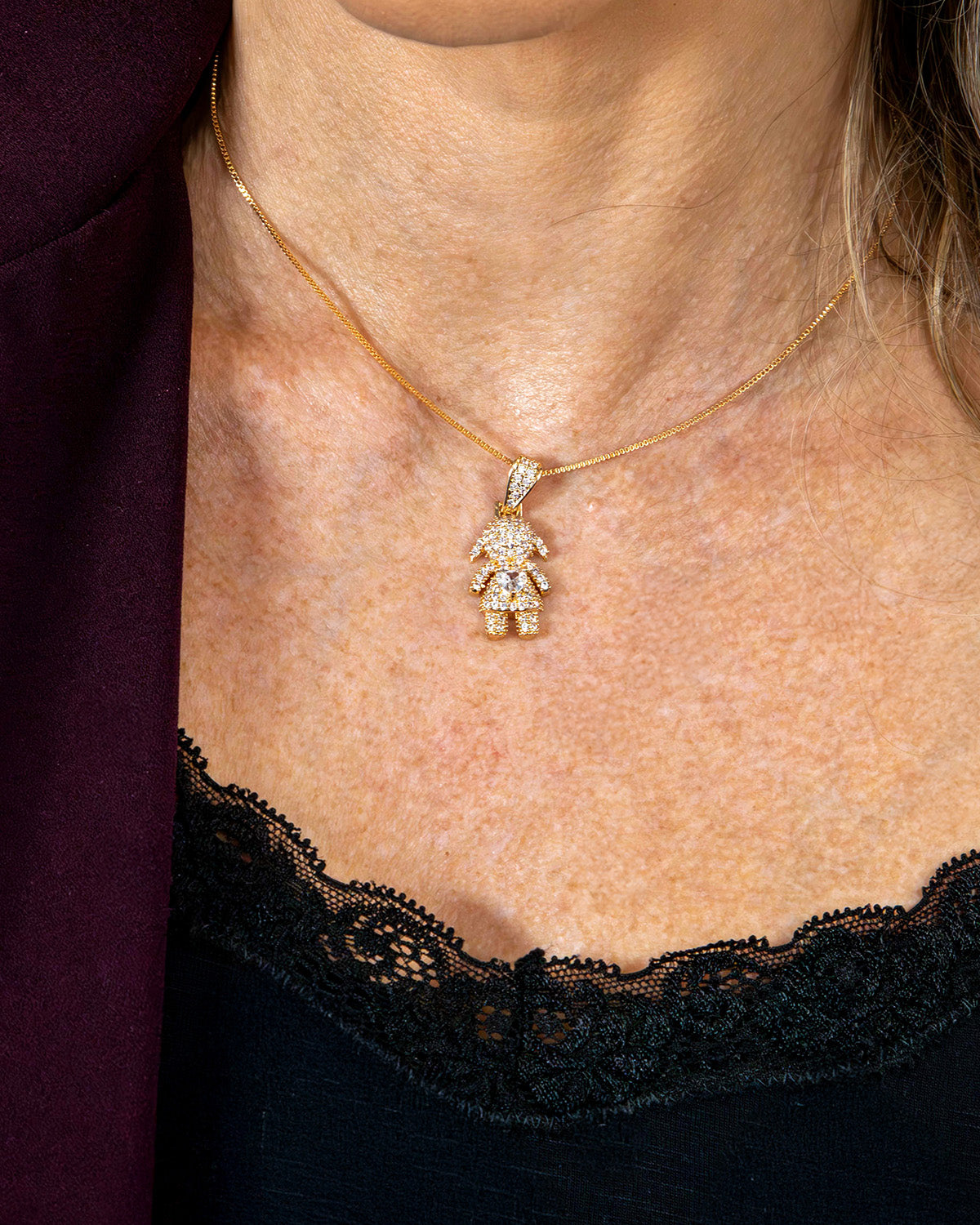 Com design gracioso e toque moderno, este colar traz o formato de uma menina com detalhes cravejados em micro zircônias, realçando ainda mais o brilho e a beleza da peça.