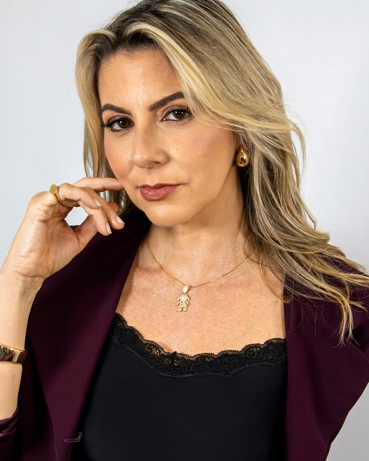 O banho em Ouro 18K confere um acabamento luxuoso, resistente e atemporal, perfeito para acompanhar momentos marcantes da vida.