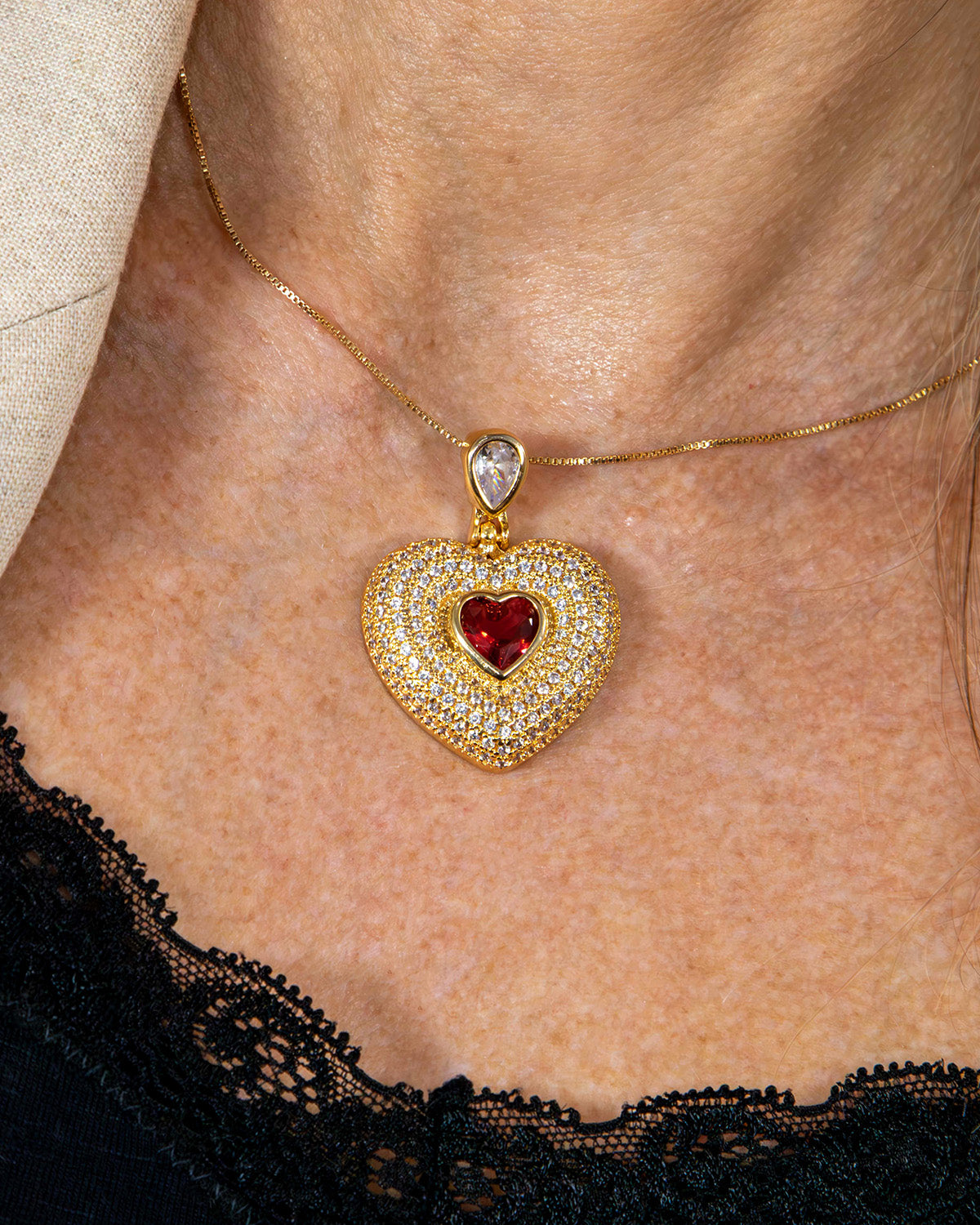 ✨ Com um coração central em pedra vermelha intensa, cravejado com zircônias brilhantes ao redor, o pingente ganha ainda mais destaque com o toque delicado da gota de cristal transparente, que traz leveza e sofisticação ao design.