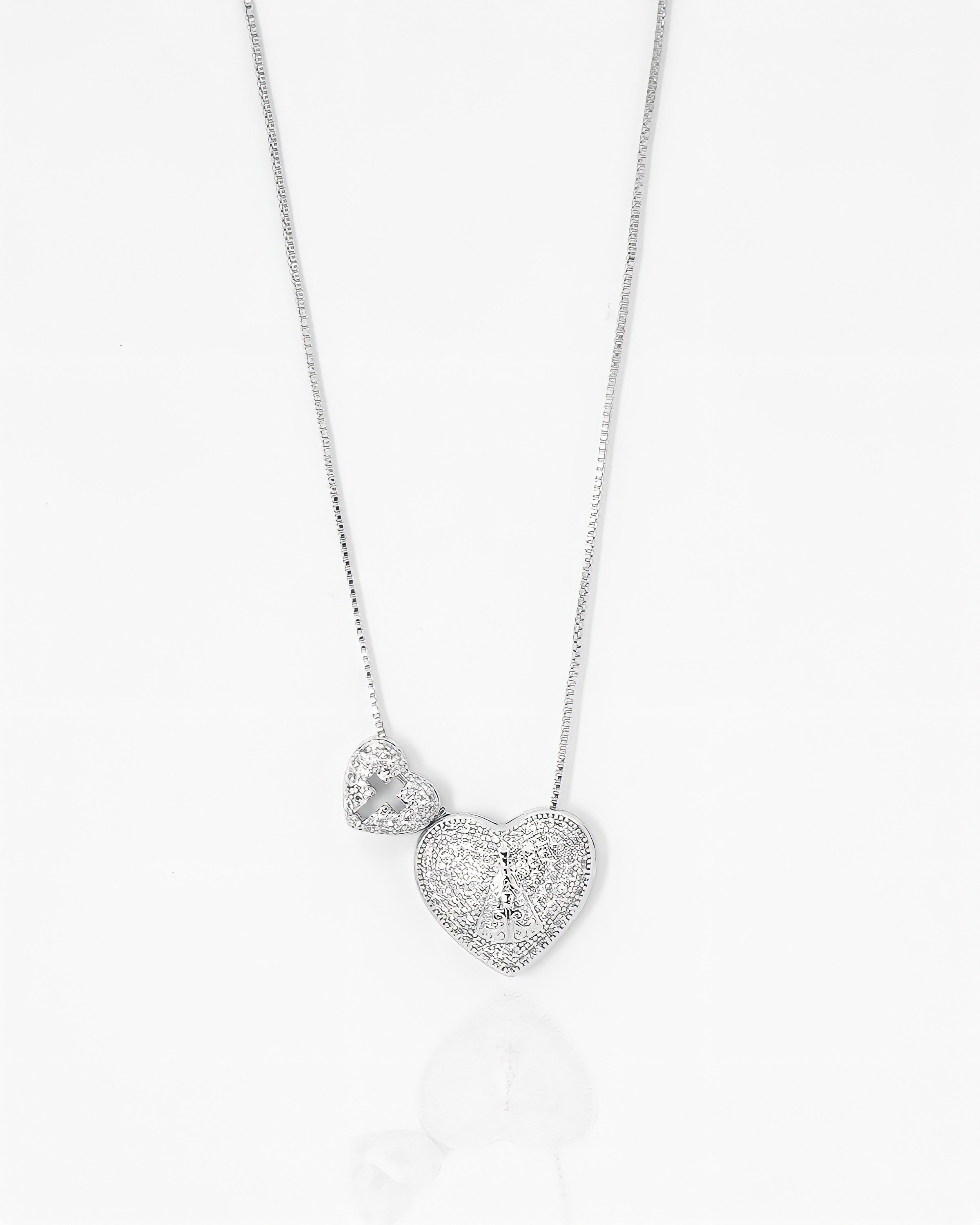 Este colar une o amor divino à proteção espiritual com o pingente de coração cravejado e a imagem de Nossa Senhora Aparecida.