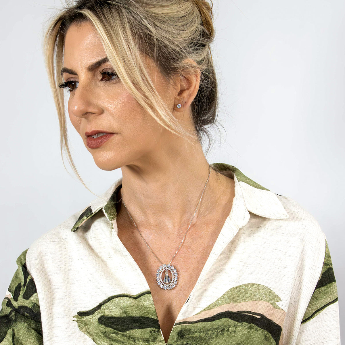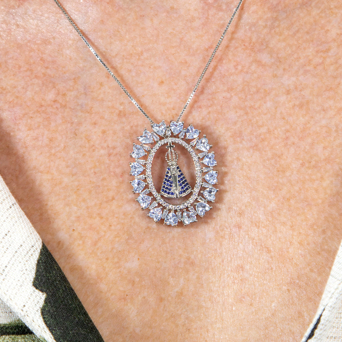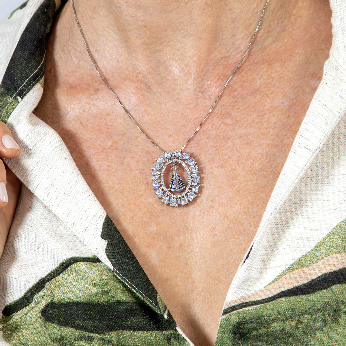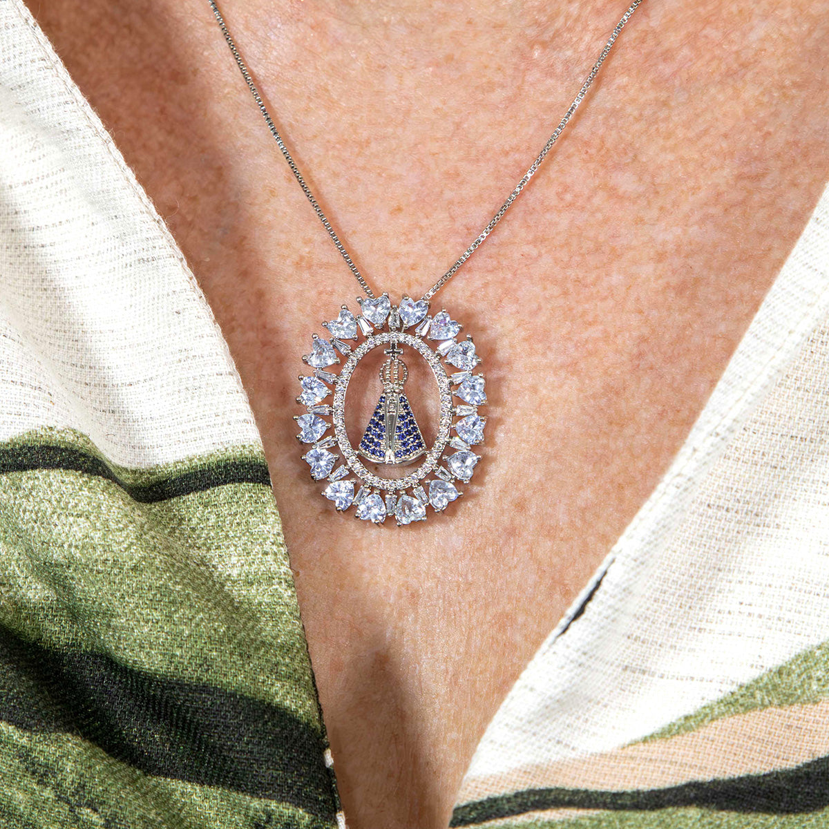 O colar mandala de Nossa Senhora Aparecida com detalhes cravejados em zircônia é a joia perfeita para quem busca proteção e estilo.
